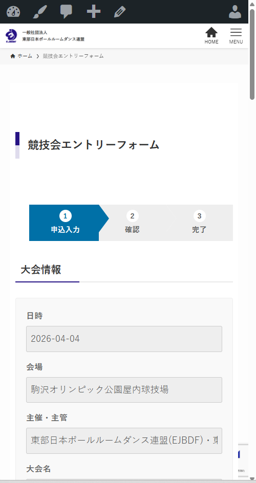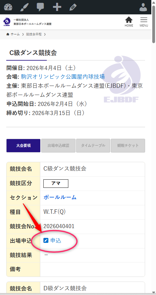 同日に複数の部門があります。ご自分の出場される部門(画像はC級アマボールルーム)の出場申し込み欄にある申込ボタンを押します。